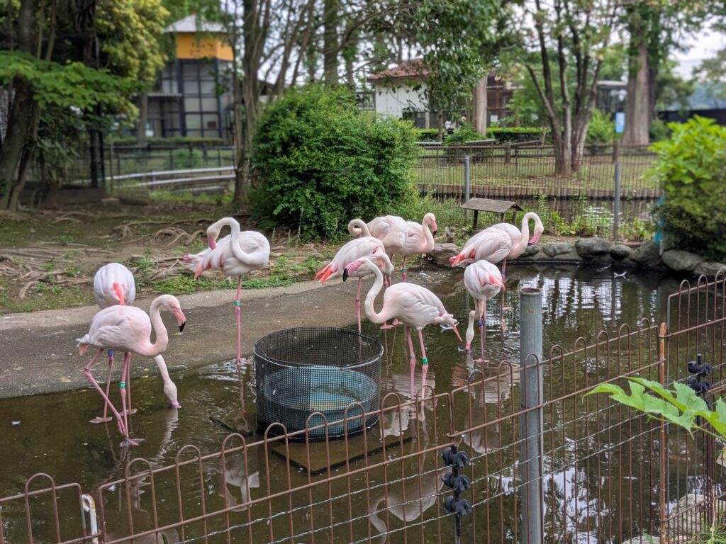 - カモ、ツクシカモ、フラミンゴ: 池の周りには、色鮮やかな鳥たちがいました。