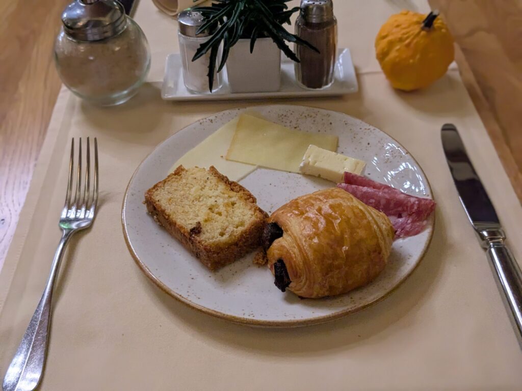テーブルに並ぶのは、濃厚なチーズ、香り高いハムやサラミ、そして外はカリッと中はモチっとしたクロワッサン。