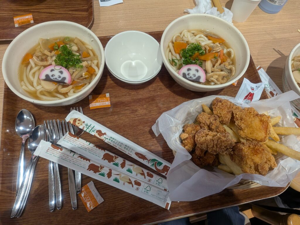 どれもボリューム満点で、動き回ってお腹が空いた子供たちは夢中で食べていました。そして何より、うどんに乗っている**「パンダのかまぼこ」**に子供たちは大喜び!「可愛くて食べられない!」と言いつつも、笑顔で完食していました。こうした細かな演出が、子供たちの満足度をグッと引き上げてくれます。