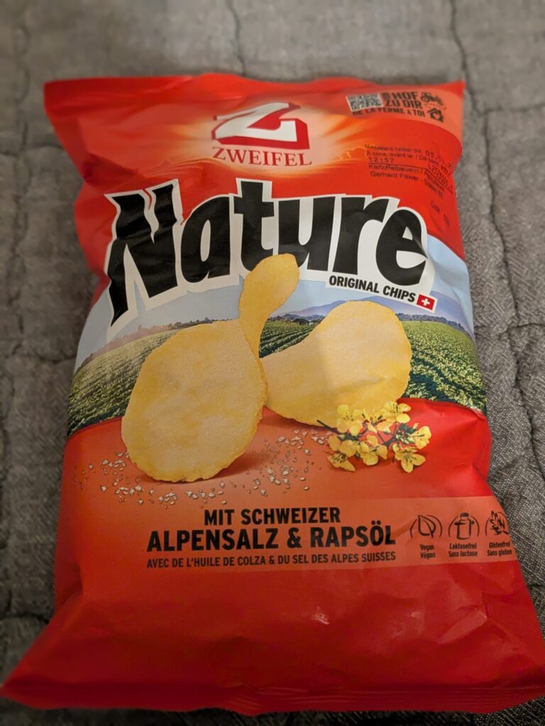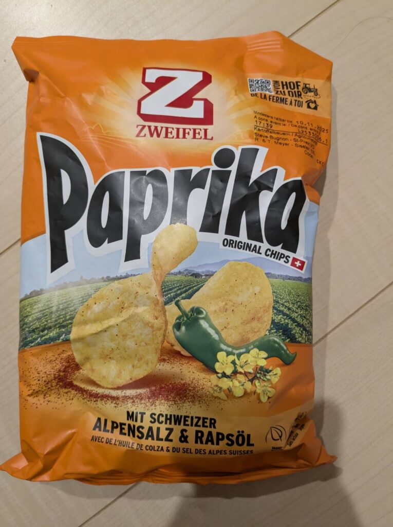スイスでポテチといえば、この「オレンジのパッケージ」一択。スイス人のソウルフードです。